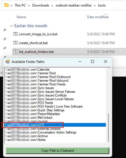 - In the extracted archive, go to the tools folder and then run the list_outlook_folders.bat file by double clicking it. It will generate list of Outlook folders that it finds on your PC. Copy the path of the one you want to get notified for.