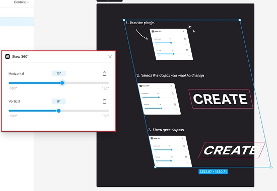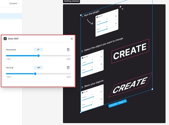 Skew 360° plugin can be used skew any element in your Figma design file. It supports both horizontal as well as vertical skewing.