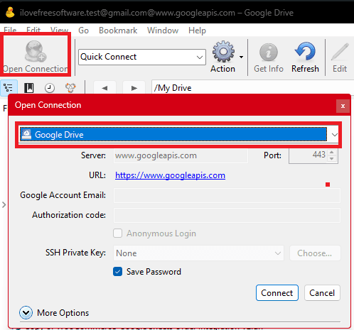 - Click on Open Connection from the top left side in Cyberduck and choose Google Drive from the dropdown. Next, you click “Connect” to start authentication.