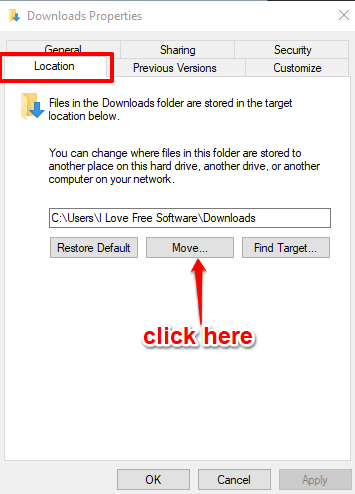 Step 3: When Downloads Properties is opened, you will see multiple tabs. Switch to ‘Location‘ tab and then click on the ‘Move‘ tab. Now you can select the destination folder or new location for Downloads folder.