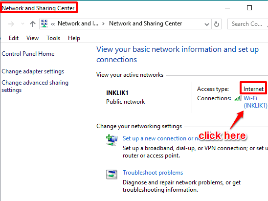 Step 2: Network and Sharing Center window will show the active Wifi network with which you are currently connected. Click on the Wifi name, and Wi-Fi Status window will open.