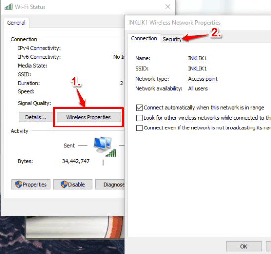 Step 3: In Wi-Fi Status window, you need to click on Wireless Properties button. This will open Properties window for the current Wifi network. That window contains two tabs: Connection and Security. You have to access Security tab.