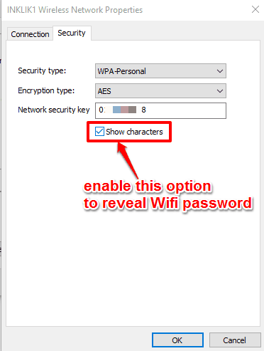 Step 4: Security tab stores the password (hidden behind bullets) of your Wifi network. Click on Show characters box and it will immediately reveal the password of Windows 10 Wifi.