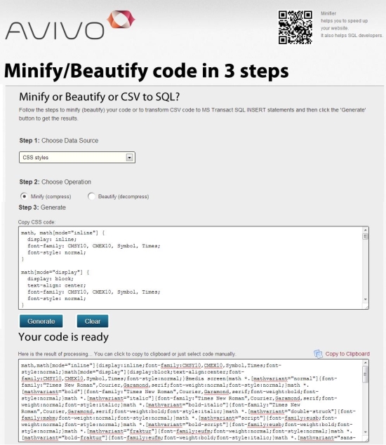 You can simply choose the data source and mode of operation, copy CSS code to the text box, and then click on “Generate” button to minify the long CSS code into a compact file.