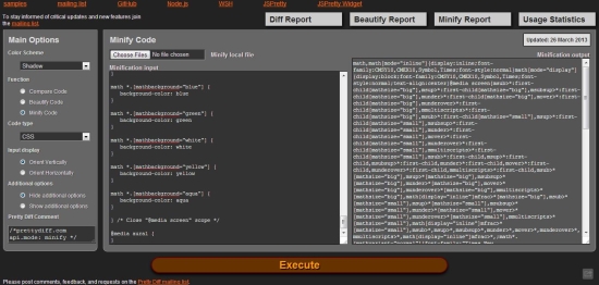 The app is quite easy to use. You can simply copy paste the CSS code in the text area or choose files from your system that you want to minify. Pretty Diff works in the fastest possible way and displays the results as soon as you finish entering the input source code.