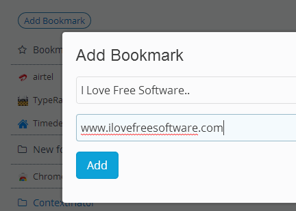 In your Bookmarks Anywhere account, click on Add Bookmark button available on your account. A pop up will open up. In that pop up, enter title name and address of bookmark that you want to save. After this, press Add button to save that bookmark.