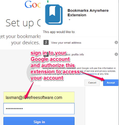 Step 3: Sign in with your Google account. After this, authorize this extension to access your Google account. This is needed to fetch all bookmarks saved on your Chrome browser.
