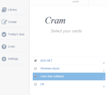 Now from Cram section, you can select decks that you want to study, and can even select cards from each deck. Thus, it is not necessary to study all cards.