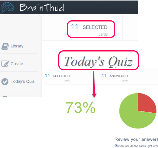 BrainThud is an online flashcard maker that helps to create detailed flashcards and lets you revise those flashcards by starting a quiz (today’s quiz). Quiz result will show you a pie chart of total correct and incorrect answers given by you. By creating a free account on this application, you can create flashcards to sharpen your memory. A Cram section is also available that helps to select cards and start revision of those cards. For each flashcard, you can add hyperlinks to question and answer, can insert image from PC (less than 2 MB), create list items, and more. Most of other similar tools do not have features to create such detailed Flashcards as can be created by BrainThud.