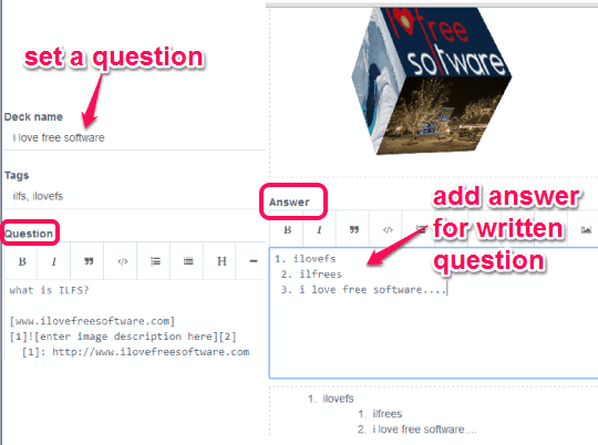 After creating the account, you can start making your own flashcards. Each created flashcard can be edited or deleted, whenever required. Use Create section and set a question, and answer for that question. You can set deck name as well as tags for that question.