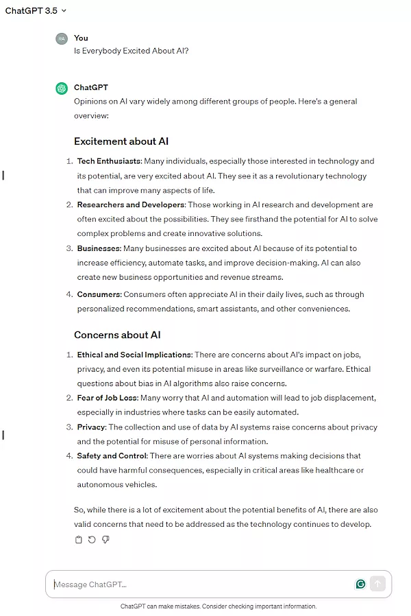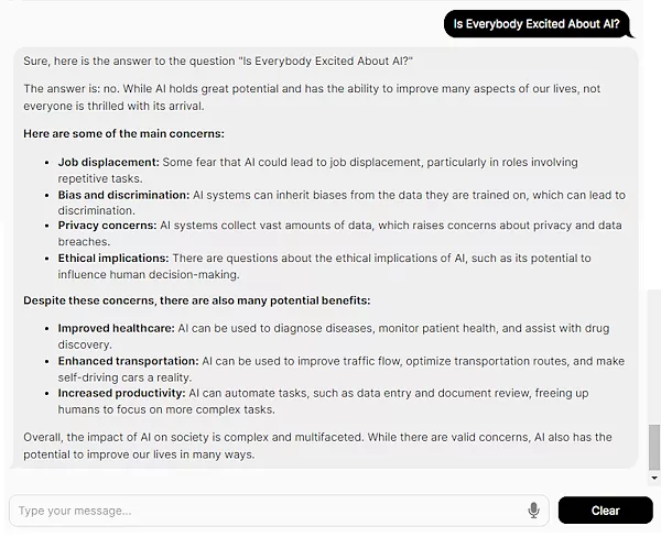 I find that Gemma’s responses are more natural offering direct answers to my queries along with appropriate details. In response to my question “Is everybody excited about AI”, Gemma AI has given a more natural and human-like response starting with a no and then providing context to its answer.