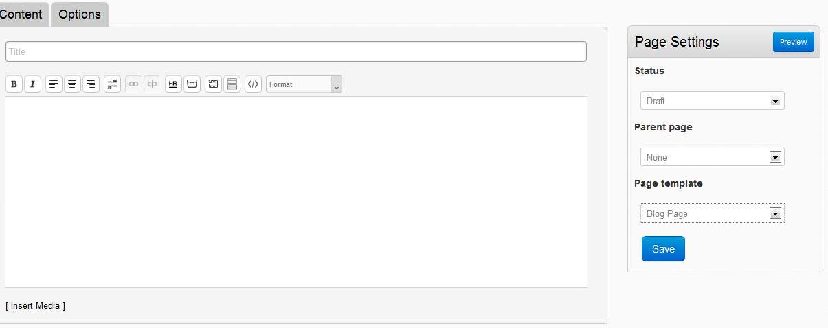Have a look on the lower right corner of the screen, that’s where you can change the default type of the page and make it a Blog Page. Everything else when it comes to creating a page is pretty much the same to creating a post, so there’s no need to talk about that again, what’s more interesting would be all the additional options that Tentacle CMS has.