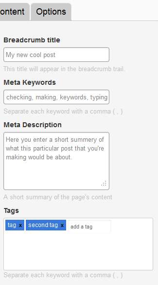 The reason why Options tabs are interesting is because it allows you to enter very important information like meta description and keywords about what your post is about. This info is very important because it allows you to make the post that you’re creating more search engine friendly in turn means that you will get better rankings in search engines and more visitors to your site. Tags can also be added, tags are a combination of categories and search tool. List of popular tags is shown in the side bar and when you click on a particular tag, all the posts on the website which contain that specific word will be listed, you can set that as well in the Options tab of Tentacle content management system.