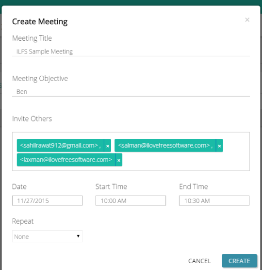 Now use CREATE MEETING option and add meeting details. You can add invitees (their email addresses), meeting title, objective, date, start and end time, repetition (if needed), and create your meeting. Invitees will receive the emails to check meeting details. However, to add attachments, and other stuff, they must create the accounts.