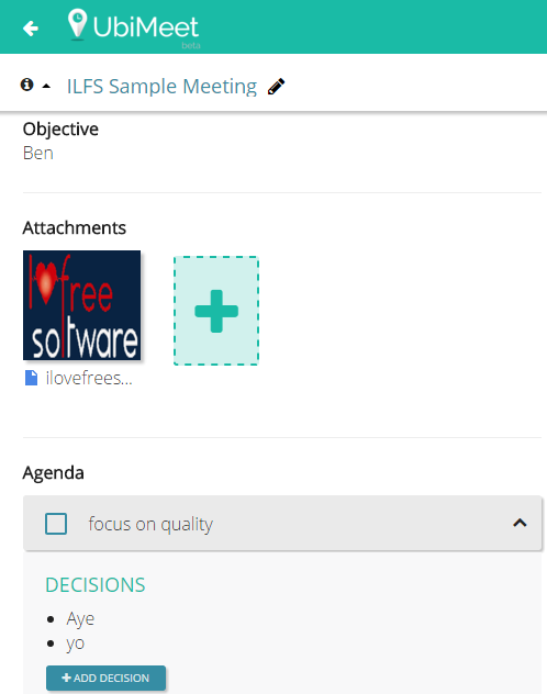 UbiMeet (beta) is a free website to create and keep track of your meetings. For each individual meeting, you can set multiple agendas, add decisions to take, and insert action items that can help to make the meeting successful. You can also invite others to let them add attachments to a particular meeting, assign them action items, and decisions.