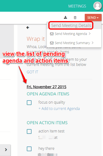 Whenever you have to check for pending agendas, action items, etc., for a meeting, just access that meeting and you can view pending items at the right side. You will also find options to download the meeting data, delete the meeting, and send meeting summary or agenda to someone.