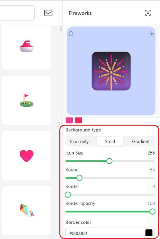 9. If you select the Background type as Solid or Gradient you will be able to change the Icon size, Radius (of the rounded corners), Border size and Border opacity using the respective sliders.