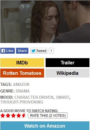 You will be able to see a still from the movie on the left hand side and a short description of the movie and actors on the right hand side. Below the still from the movie you will see four buttons. The IMDb button lets you check the movie rating on its website, the Rotten Tomatoes button lets you check the rotten tomatoes score of the movie, the Trailer button lets you watch a trailer of the movie on YouTube and the Wikipedia button lets you read all the details about the movie on Wikipedia. Apart from this you can also see tags, genre and mood for the movie given below. Under this there is a section of user rating, where people who saw the movie can rate it on a scale of 1 to 5.