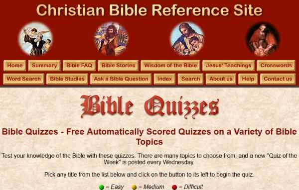 Christian Bible Reference is a website with lots of Bible quizzes. The home page of the Bible quizzes section can be seen in the screenshot above. All the quizzes are listed on this page. You can choose any one to start playing. The quizzes that are found on this page are quiz of the week, books of the Bible, famous Bible quotations, Bible basics, youth section, famous Bible stories, Moses, etc. The quizzes are marked with green, yellow, or red indicators. Green indicator means easy quiz, yellow means medium difficult, and red means difficult quiz.