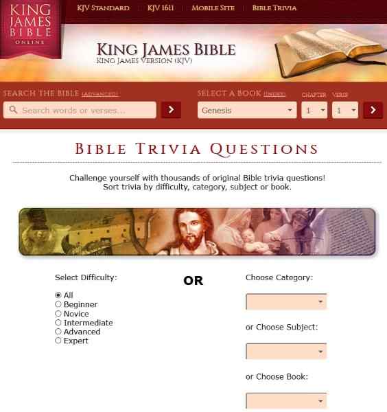 King James Bible Online has a entire Bible trivia section to play lots of quizzes. The quizzes home page can be seen in the screenshot above. On this page you can select the level of difficulty to test your knowledge. You can choose among beginner, novice, intermediate, advanced, and expert. You can also choose a category of the quiz you want to play. There are 3 broad categories, subject, book, or category. You can choose anyone of these and then from the drop down window select your choice of topic. Then click the start the quiz button. This will take you to the quiz page.