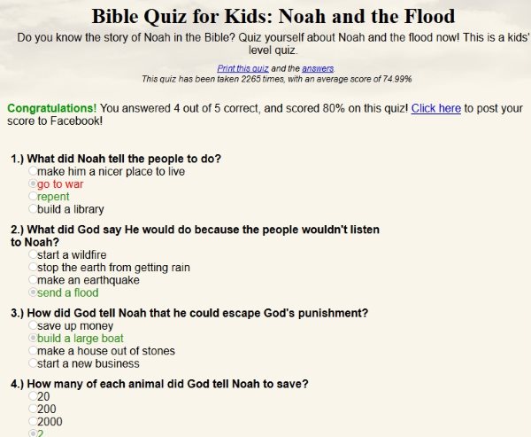 This will show you a pop up telling you the percentage you scored in the quiz. You will also be shown the quiz page again as seen in the screenshot above. Here all your correct answers will be seen in green color and the wrong answers will be seen in red. The top of the page shows you how many questions you answered right and percentage scored. There are lots of Bible quizzes which you can take and improve your knowledge about the Bible.