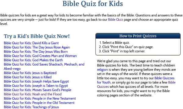 Religion Resources Online is a free website with lots of Bible quizzes. The Bible quizzes on this website are divided in to various categories like printable Bible Quizzes, quizzes for youth, quizzes for kids, quizzes for adults, popular Bible quizzes, new testament, the creation, old testament, etc. You can select quizzes for any category. Just click on the quiz category that you would like to start with. All the quizzes under that category will be listed on your screen. For example I started with Bible quizzes for kids and all the quizzes in that section were listed like shown in the screenshot below.