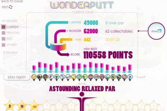 Once you have completed the whole game, the score board will show how much time you took to complete this online golf game, and how many stroke points, wonder points, time points, and total points you have got. You can view previous scores and best scores also. You can jump to any of the level you have completed or else play the whole game again. You can also see what achievements you have earned during the game: Putt Putt Pass Badge, 1 Ball 1 Cup 1 Stroke Badge, and It’s a Wonderputt life badge, and you get extra points for these.