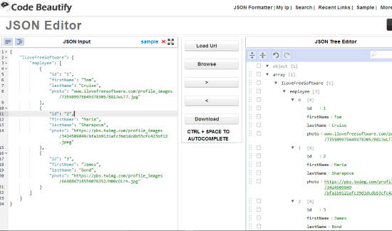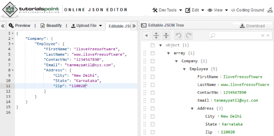 Code Beautify is one of the best online JSON Editors in this list. You can upload JSON file from PC, paste JSON code, or add URL of online JSON file for editing. The left section is used to edit the JSON file and right section shows the output. It doesn’t show output in real-time but previewing output is just a matter of click. The best part is you can edit the output and add changes in the JSON code and vice-versa.