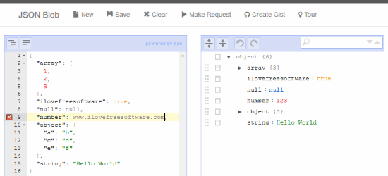 Jsonblog.com is also a good JSON editor website, but it doesn’t support feature to upload JSON file from PC. You can either paste the code of JSON file or create a new JSON file. Also, you can’t save output directly to PC. You need to copy the code and manually save it as JSON file or save it online publicly. So, these are the limitations of this website and therefore I think it is helpful only when you have to do some editing with a public JSON file.