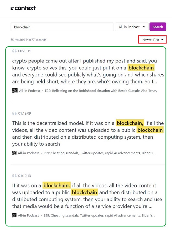 Context is an AI Powered search engine specifically built for searching long-form Audio / Video Podcast content. Context is in the early stages of development, and they have begun by indexing All-in-one Podcast which is an easy-to-use Podcast Platform owned by Chamath Palihapitiya, David O. Sacks, and David Friedberg.