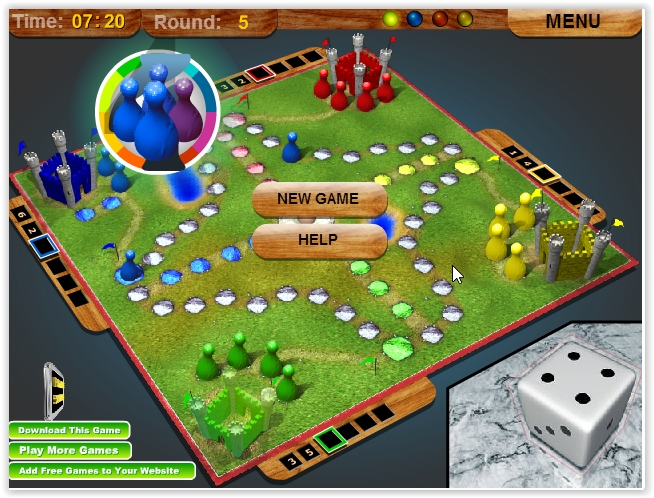 The first website to play Ludo online is freeonlinegames. The name of the game on this website is Flash Ludo. It is just like playing the game manually on a Ludo board. You are randomly given a color and you get the first chance to roll the dice. A dice is provided just below the board and you just have to click it to roll it. If you score a six, you open your account and move forward. Every time you cut your opposition’s token you get an extra chance. To read the full instructions of the game, you can click on the Help button shown in the Menu. You can also view the total time and rounds shown just above the board.
