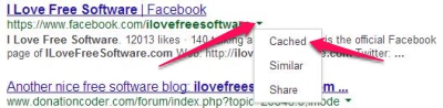 This would bring to you all the cached results for ilovefreesoftware.com. Alternatively, you can type in the keyword for which you want to view the results for, and click on the tiny down arrow that appears with each result shown on the page and choose the “Cached” option to view the cached result for that page.
