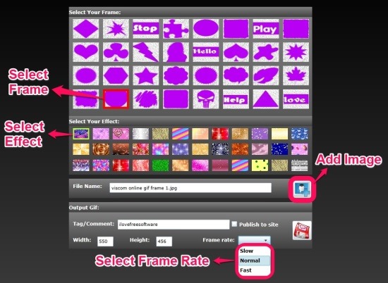 ViscomSoft provides an online application to add beautiful animated frame on your photos using GIF frames and effects. It comprises of 32 GIF frames and 36 effects in it. It facilitates you to select the GIF frames and effects which can be applied to any JPEG image so as to obtain a GIF file as an output. It enables you to customize width and height and allows you to select an appropriate frame rate.