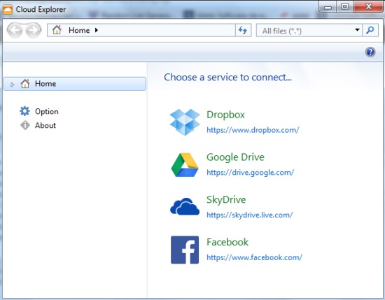 Its interface currently supports four cloud storage services: Dropbox, SkyDrive, Google Drive, and Facebook. More will be added in future. To use these services, you first need to log in to all services one by one using your web browser, and then you will be able to authorize Cloud Explorer to your accounts.