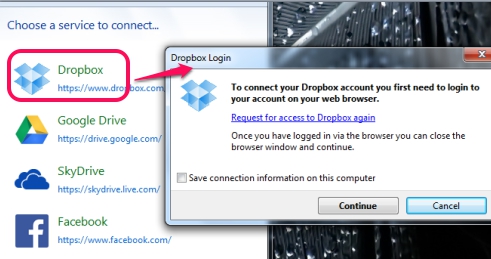 Procedure is quite similar for connecting all the available services with Cloud Explorer. You need to login to service, give Cloud Explorer authorization, and then stored contents will be visible on Cloud Explorer. For example, if you want to connect Dropbox account with Cloud Explorer, then click on Dropbox option. It will open a pop up window and Dropbox webpage on your default web browser.