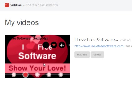 vidd.me is a free online video sharing service that helps to publish and share videos online with people. It’s an instant video sharing service which you can use to upload videos or animated gifs. Any funny moment of your life, adventurous video captured by you, or anything that you have as video can be shared on vidd.me. You can even add title and description to upload your video. This video hosting website helps to upload any format video and file size also doesn’t matter. You can anonymously upload videos, but you won’t be able to delete them. To manage videos, you can create a free account. With vidd.me account, you can even like and comment to public videos and vice-versa.