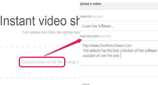 Go to its homepage where you need to add a video file either using upload option or by drag n drop support. You can even add animated gif which will be converted automatically into video format (same quality). Immediately after adding a video, it will ask you to enter a title and description about that video.