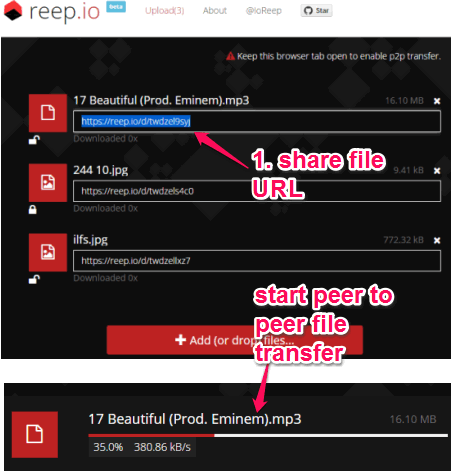 reep.io provides secure and direct file transfer process. Apart from this, it has come with password protection feature, and ability to download multiple files together. These features have made it an advanced P2P file sharing website.