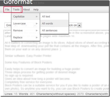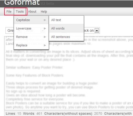 As it is clearly visible in the screenshot mentioned above, you can simply type or paste any desired text in the available text box. After this, you can access Tools menu that helps to perform desired action. For example, if there are extra spaces (if any) present in text provided by you, then you can easily vanish them within a second using Remove option. Likewise, you can perform other steps too. Make your text even good and modify it according to your need.