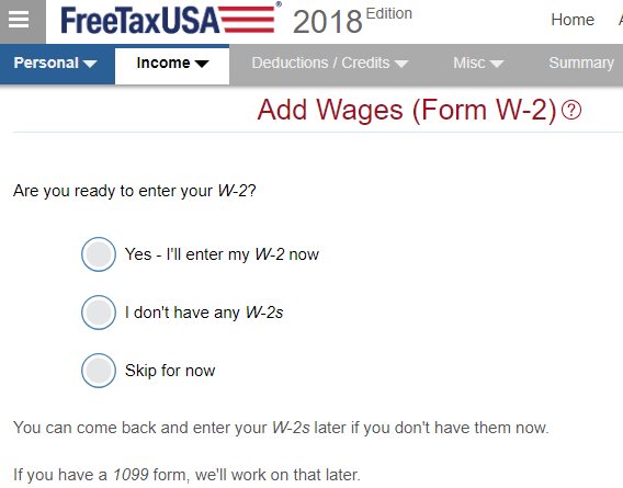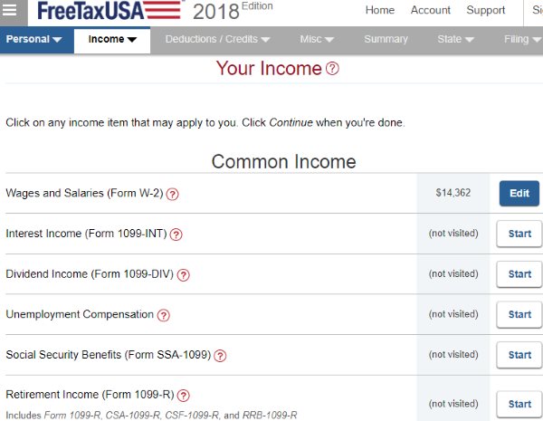 After a summary page of your personal information, you will be taken to the income section. The first section is entering your W-2 information. Enter the information as given in your W-2. Add as many W-2’s as you have. At the end you will be shown a summary of your W-2 income. Then other income categories will be shown to you. You can go through each one and see if any of them is applicable to you. At the end you will be shown a summary of your income section.