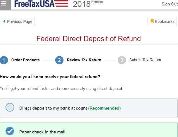 Now you will be shown if you qualify for a free tax return or not. If you do then you can proceed with choosing a refund option. You can get your refund directly deposited to your bank account, or you can receive a paper check at your mailing address. Choose a refund option for both your federal and state tax returns.