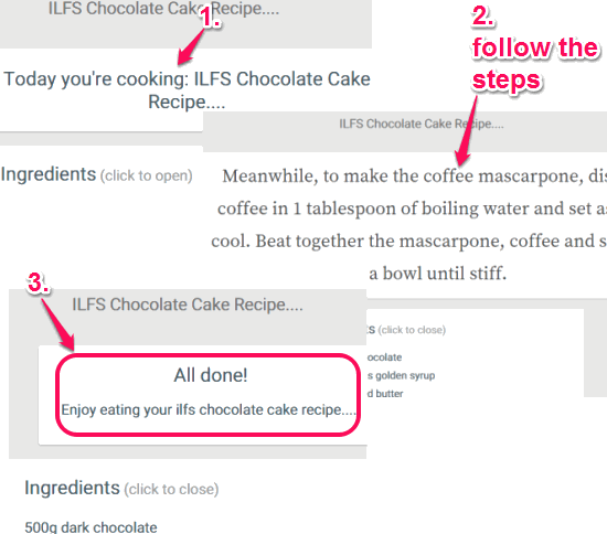 - It provides a ‘cook mode‘ that guides to cook any saved recipe in the kitchen. You just need to use ingredients and keep an eye on recipe steps for preparing a dish. When you have opened a particular recipe, you will find icon on bottom right corner to go to the cook mode. After this, cook mode will guide you to cook that recipe with steps.