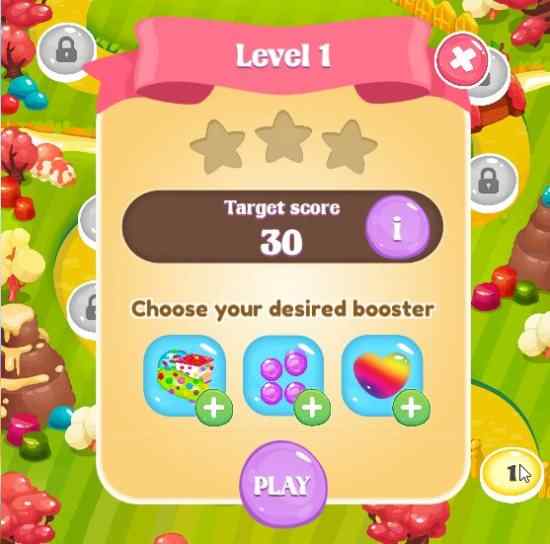 When you click on level one, your target for the level will be displayed in a pop up window, as can be seen in the screenshot above. You can use the free coins you have to buy boosters or special power candies displayed at the bottom of the screen. Click on play button to start the game.