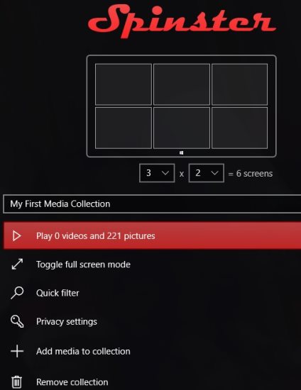 You can also add more media files to your collection or use the last option to remove collection. The first button is for playing your collection pictures and videos. Above this button you have two drop down buttons with numbers in them. These numbers tell you how many rows and columns you pictures will be divided into. Here 3 x 2 means 3 columns and 2 rows will be formed to display your pictures, as can be seen in the screenshot below.
