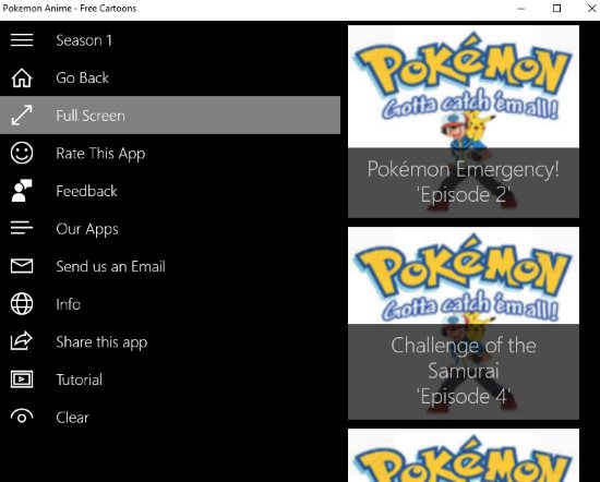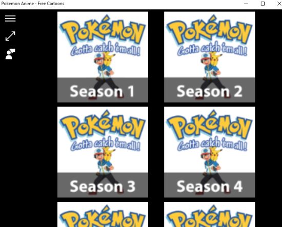 Pokemon Anime is a great app to watch the entire Pokemon series. The app beautifully lists all the seasons of the cartoon with all the episodes in them. Just select any cartoon that you would like to watch and it will start playing in the app window itself. You can also make the video play in full screen mode. You can also pin your favorite videos to the start menu, so you do not have to search for them every time you feel like watching it.
