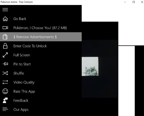 It will give a option to go to the previous window, show you the title and total size in MB of the cartoon video that you are watching, show an option to make the video full screen, option to pin the video to start menu, change the video quality, etc. You also have the option to remove ads by upgrading to the paid version of the app.