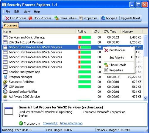 Security Process Explorer is a free process explorer that helps you to manage or control the processes running on your Windows computer. This task manager displays detailed information about the processes, it displays the file name, detailed description, directory path, etc related to a process. Security process explorer helps you to monitor and stop unnecessary processes with an ease. It even shows you the memory usage and CPU usage individually for each process running on your Windows computer. You can even make this software appear on pressing Ctrl+Alt+Delete or by right clicking on the taskbar, so in this way you can use it as a good alternative to Windows task manager.