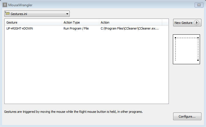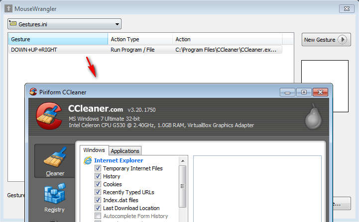 Gestures can be activated by holding down the right mouse button, and then doing the mouse movement that was saved, make sure to do it precisely. For starting up CCleaner we decided to set down >> up >> right, so we right clicked and moved our mouse down then up followed by right. Indicator of each gesture that you make will pop up, and you can even have lines drawn on the screen when you’re doing the gesture.