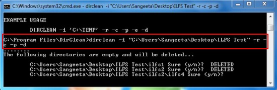 For example, I have typed “dirclean -i “C:\Users\Sangeeta\Desktop\ILFS Test” -r -c -p -d” to remove empty folders and directories from a test folder. The “-i” option tells which directory I want to scan, “-r” option commands DirClean for recursive scan, “-c” option logs empty directories to console, “-p” option enables prompt to confirm delete, and “-d” option deletes the directories.