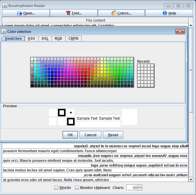 As soon as you open up the documents its gonna be opened in the proper speed reading format where one line is regular and another one is mirrored next to it. If you want you can use the menu at the top of the application in order to change text color, font, and so on.